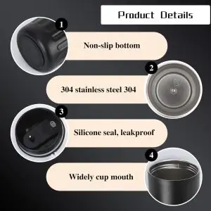 • Leak-proof design: the coffee mug lid is equipped with a sealing silicone that prevents liquid spills. The rubberized design at the bottom prevents the cup from slipping or tilting. Whether it’s coffee, tea, juice or milk, this insulated mug is easy to store and meets your various beverage needs